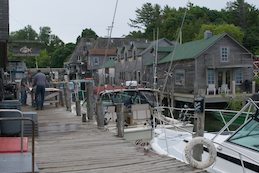 Left: Historic "Fishtown" in Leland, MI, now shops and charter sport fishing for exotic salmon planted by the millions. Right: Aboard the ferry to South Manitou Island. Yes, it was gray and drizzly all day. |